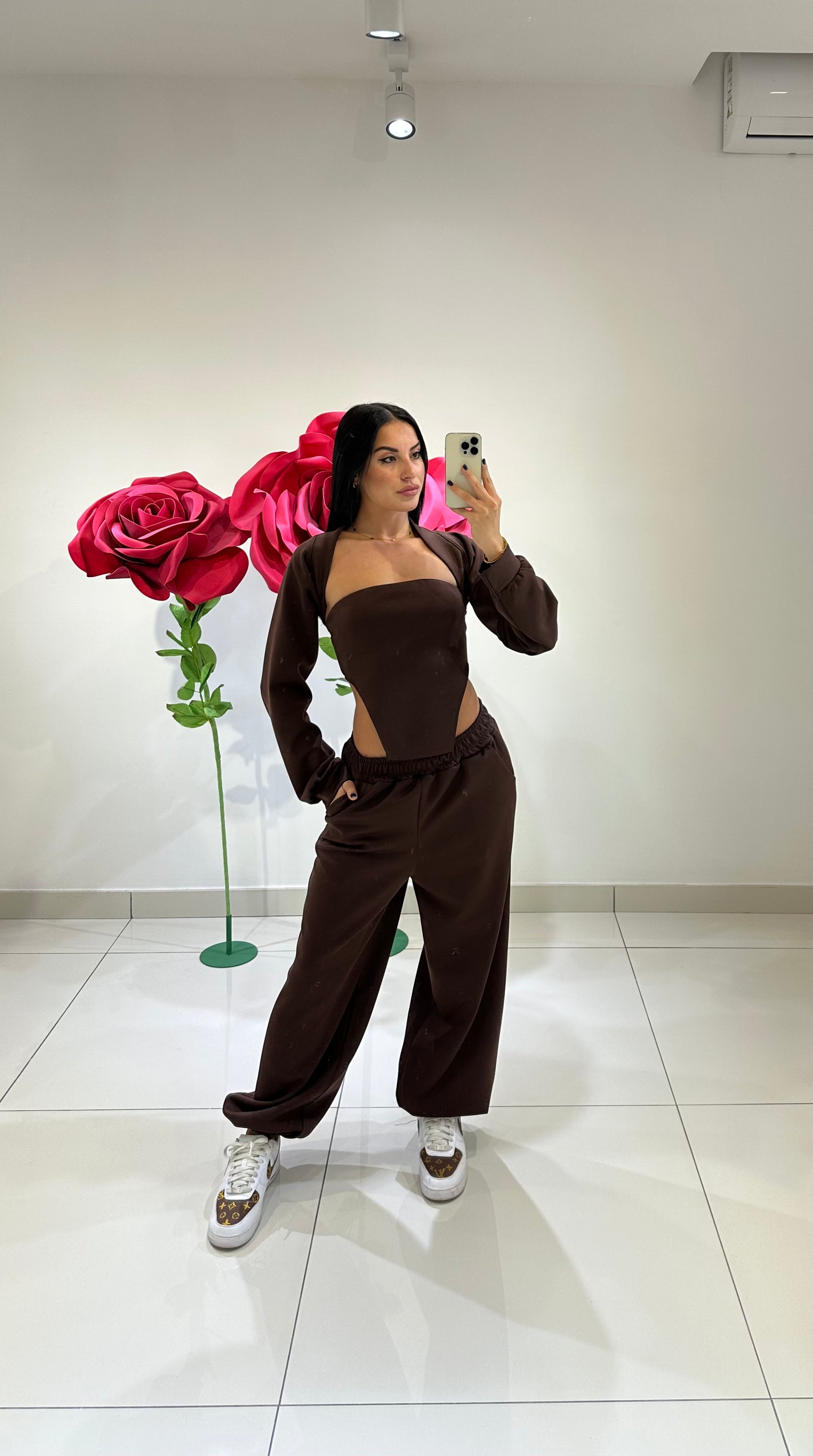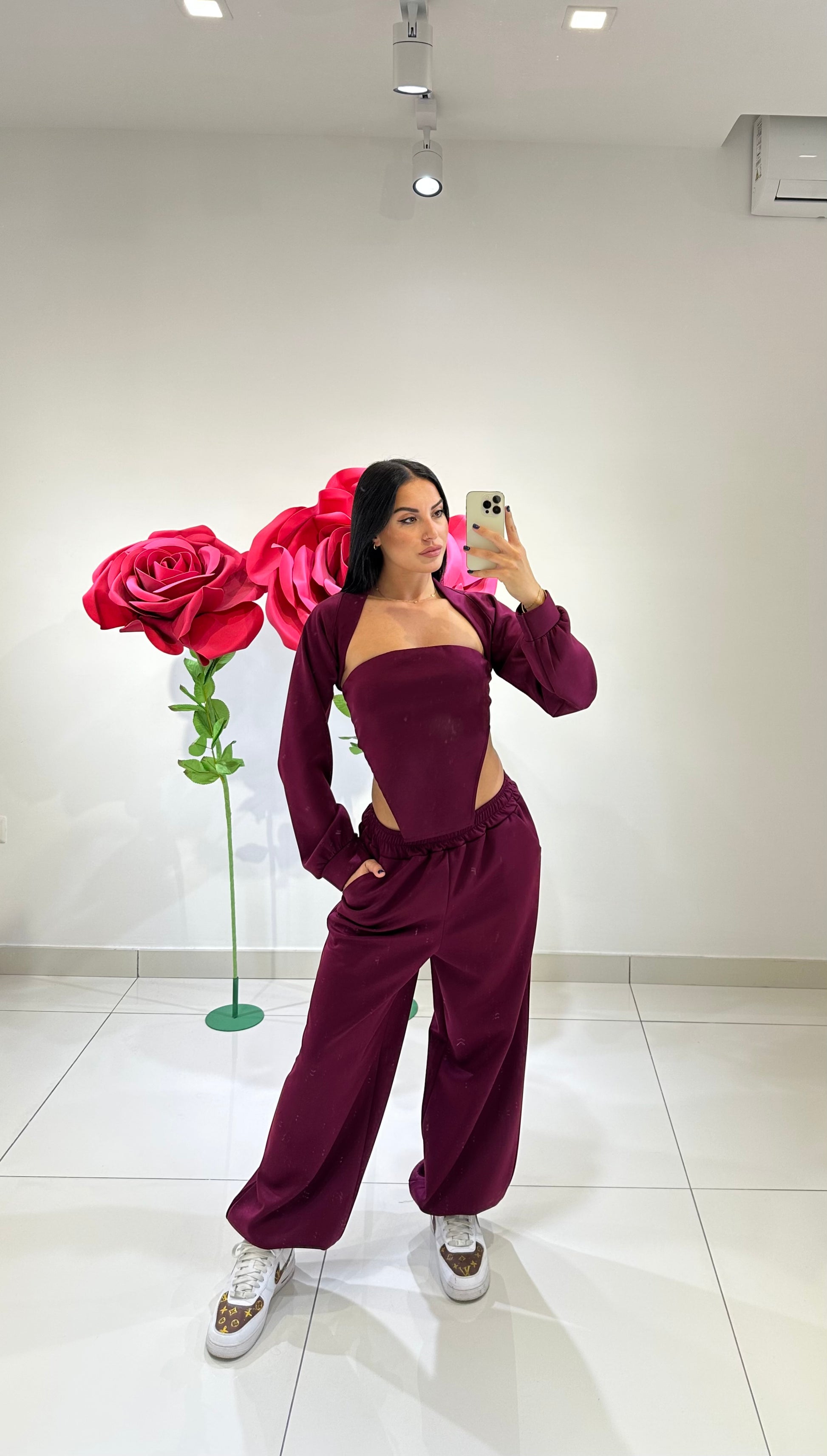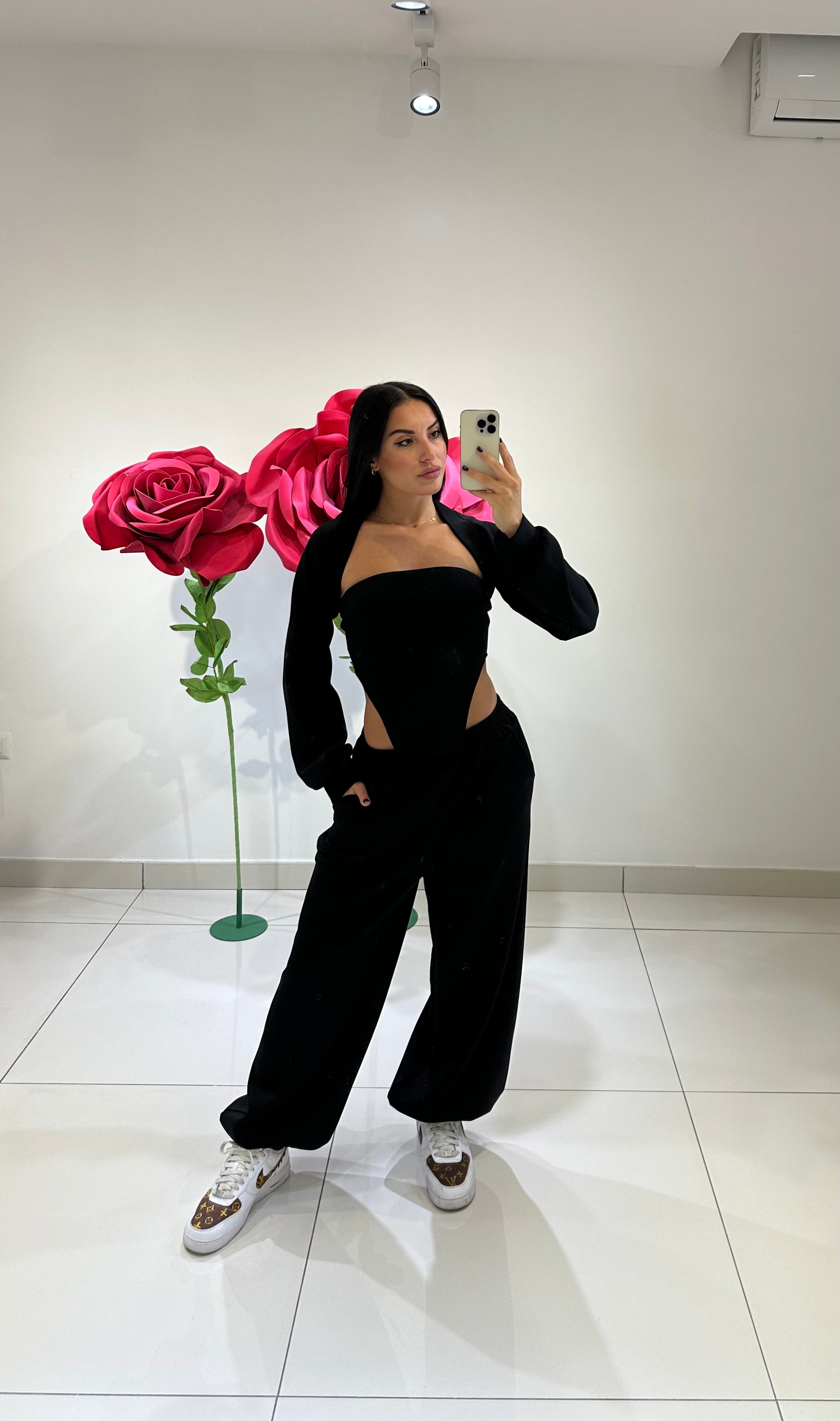 SET IN FELPA, COMPOSTO DA CORSETTO CON COPPE PREFORMATE, PANTALONE BALLOON E COPRISPALLE. IN VARI COLORI