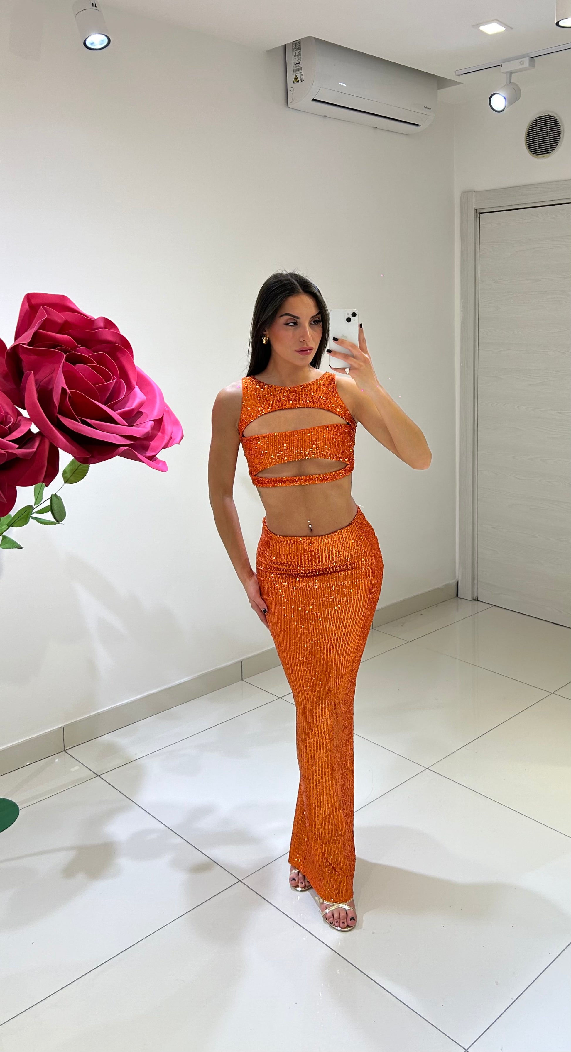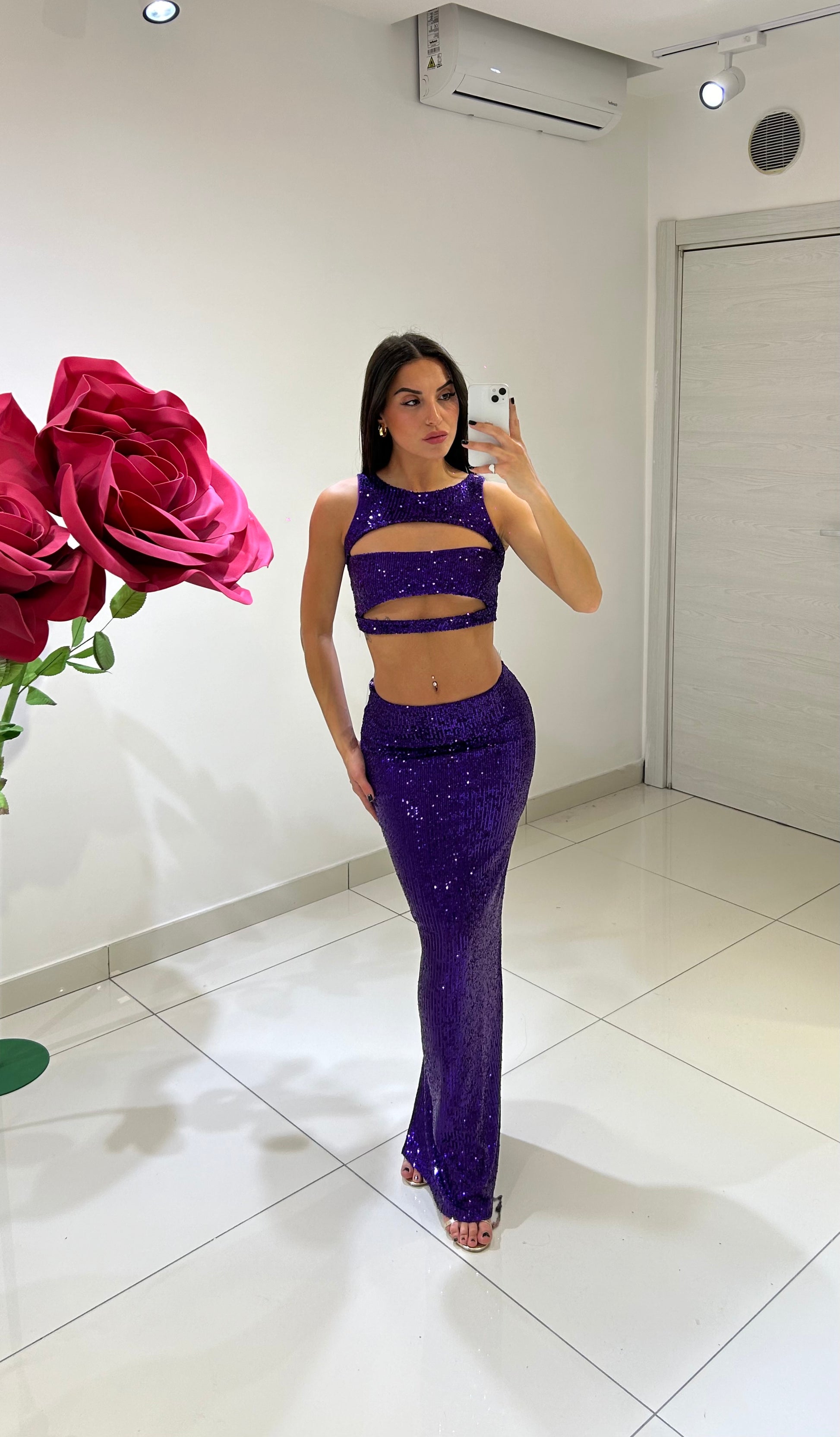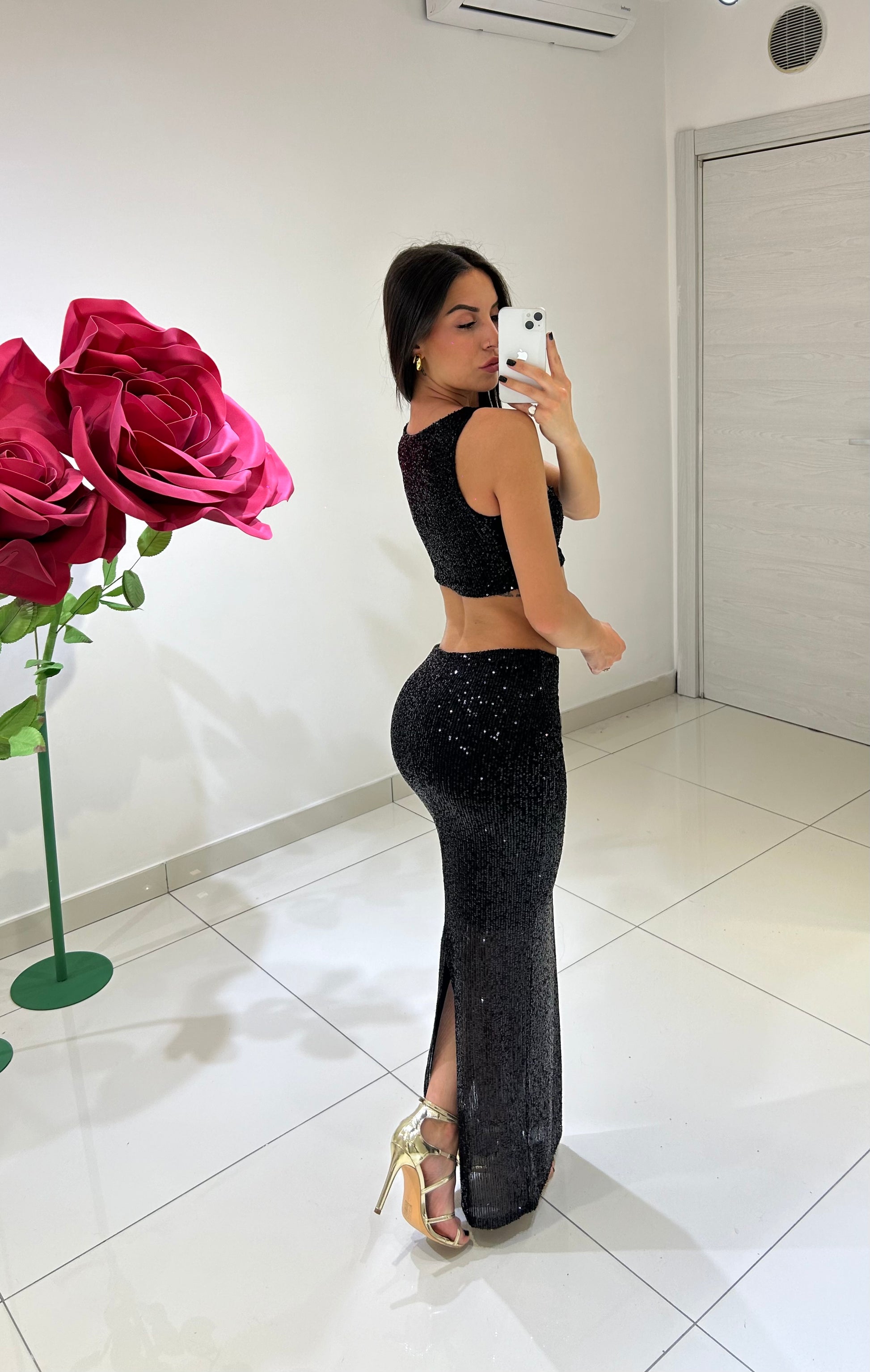 SET FULL PAILLETTES, TOP CON APERTURE E GONNA A LUNA A SIRENA CON SPACCO SUL RETRO, IN VARI COLORI