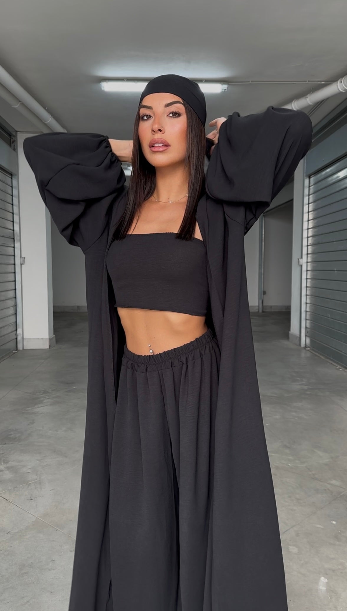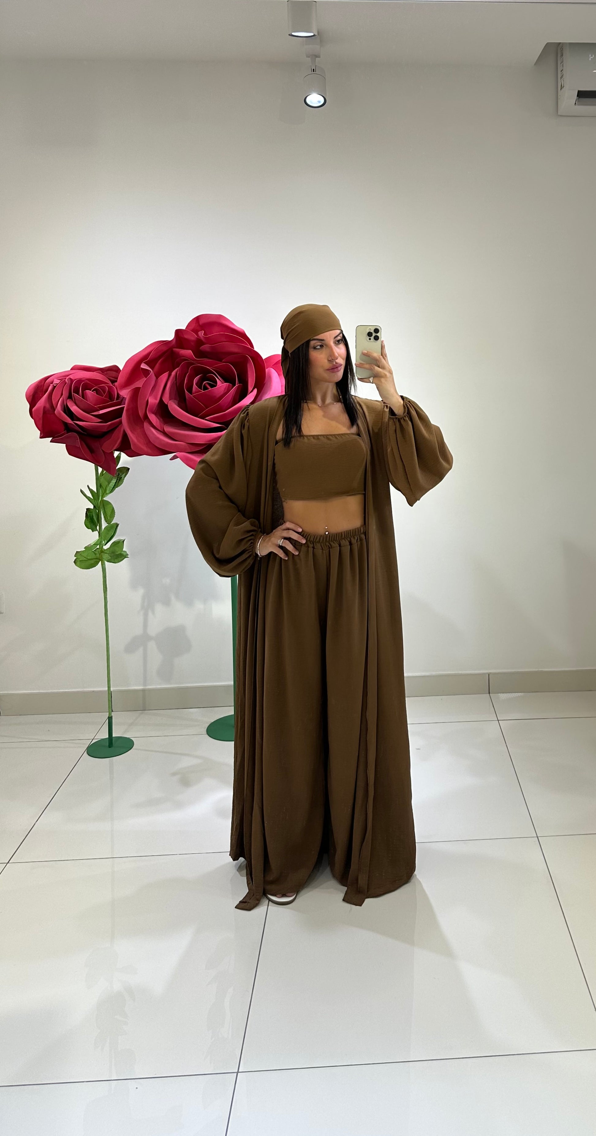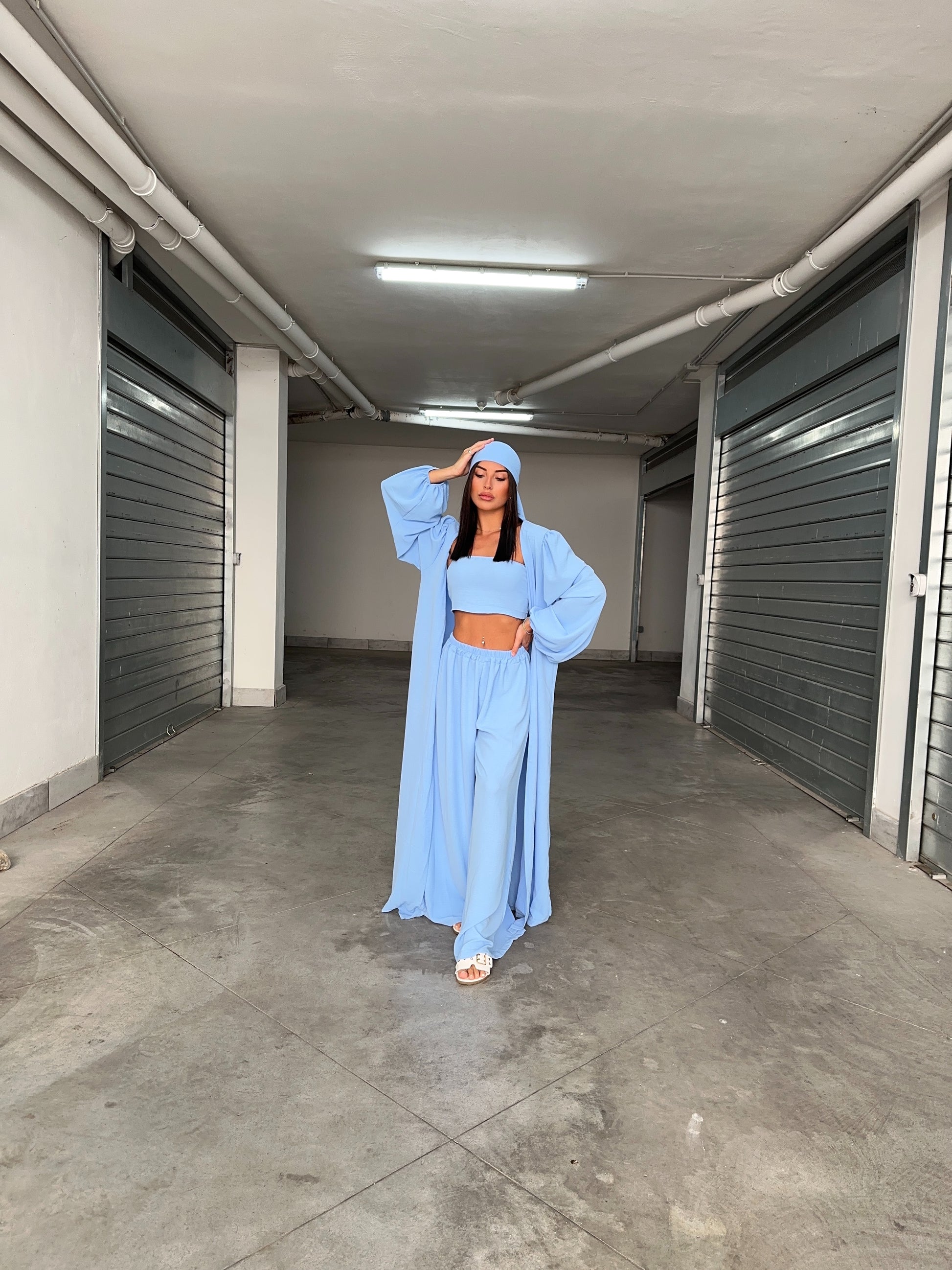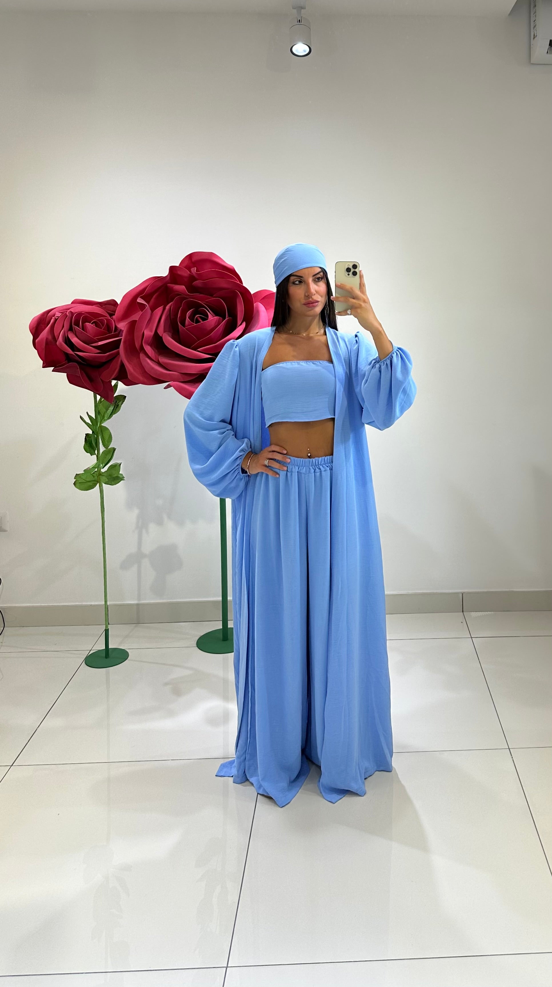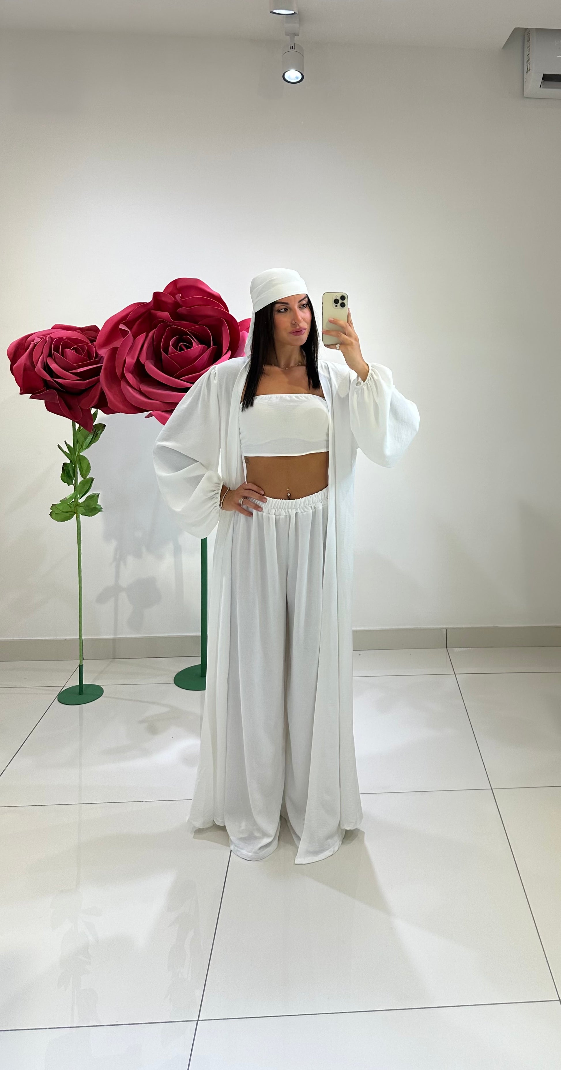 SET IN SIMIL LINO, TOP A FASCIA, PANTALONE GAMBA LARGA, CARDIGAN LUNGO CON MANICA A SBUFFO, BANDANA. IN VARI COLORI