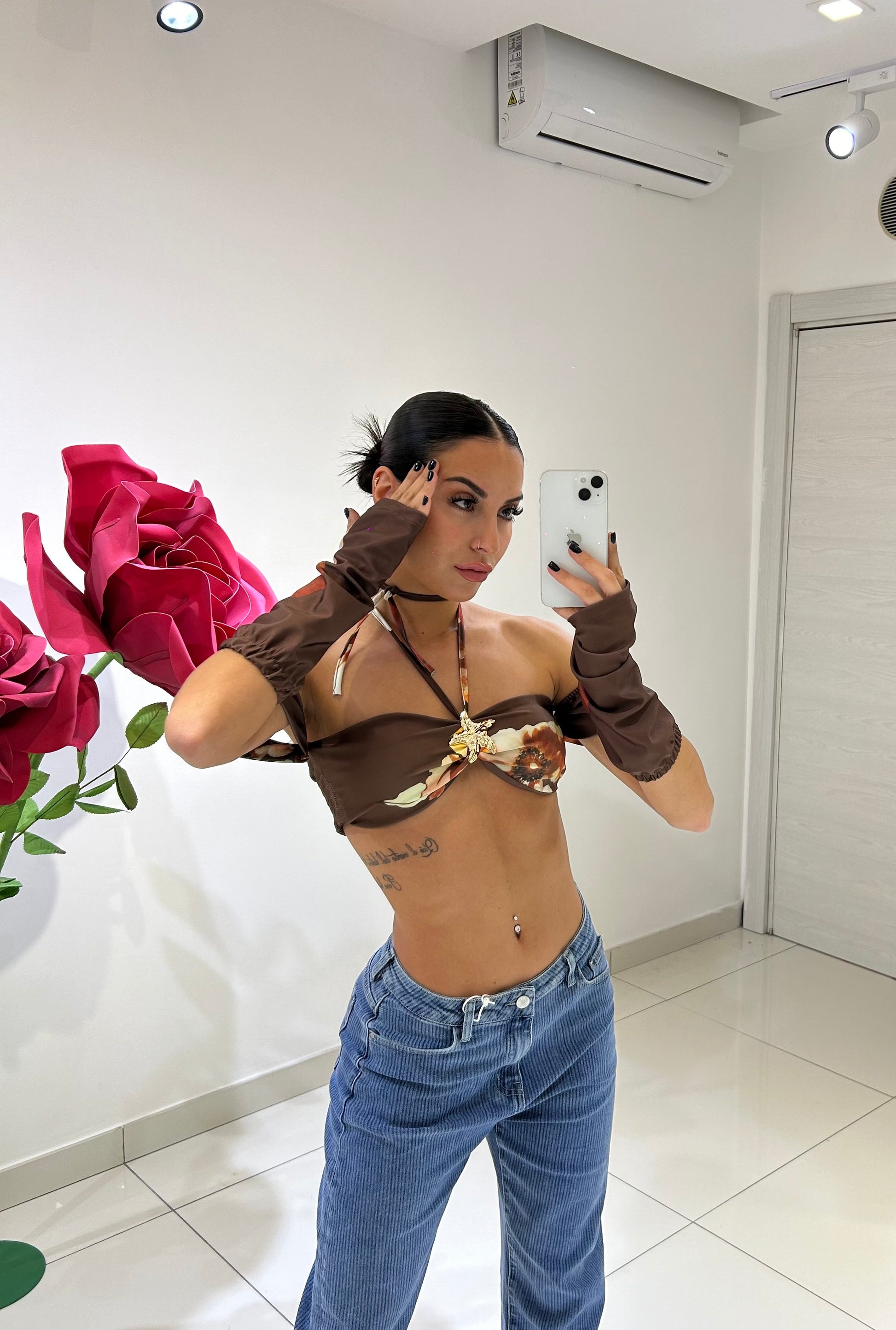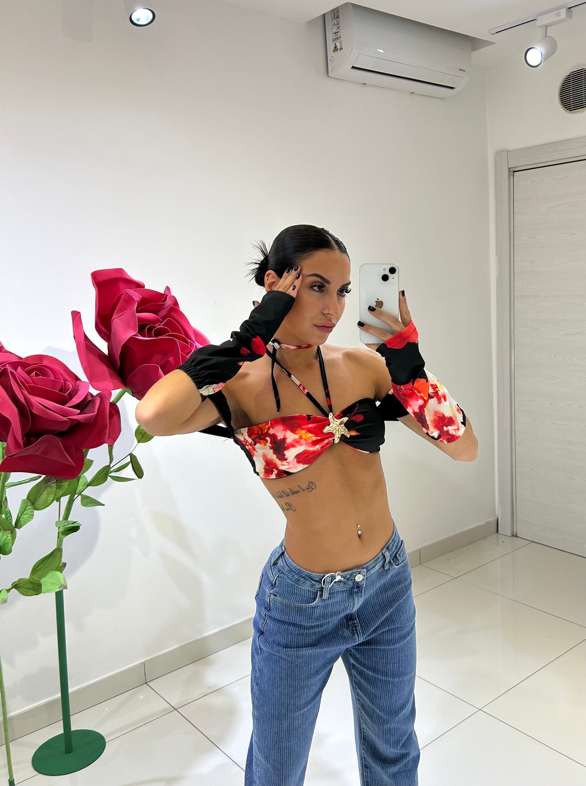TOP IN LYCRA FANTASIA FLOREALE CON DETTAGLIO GIOIELLO ORO, SPALLINA SCENA E MANICOTTO MEZZO GUANTO, IN VARI COLORI